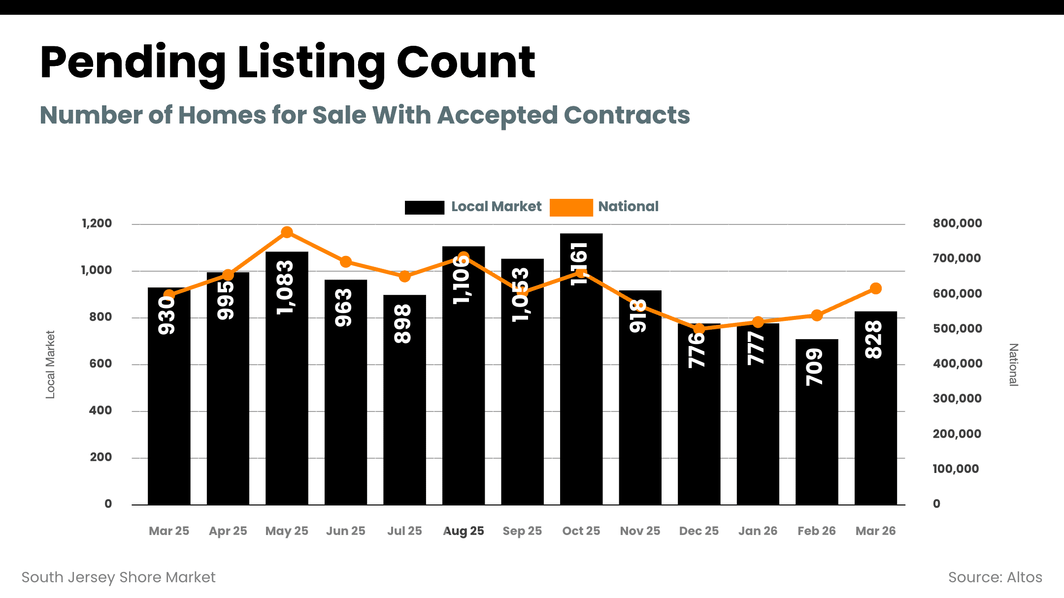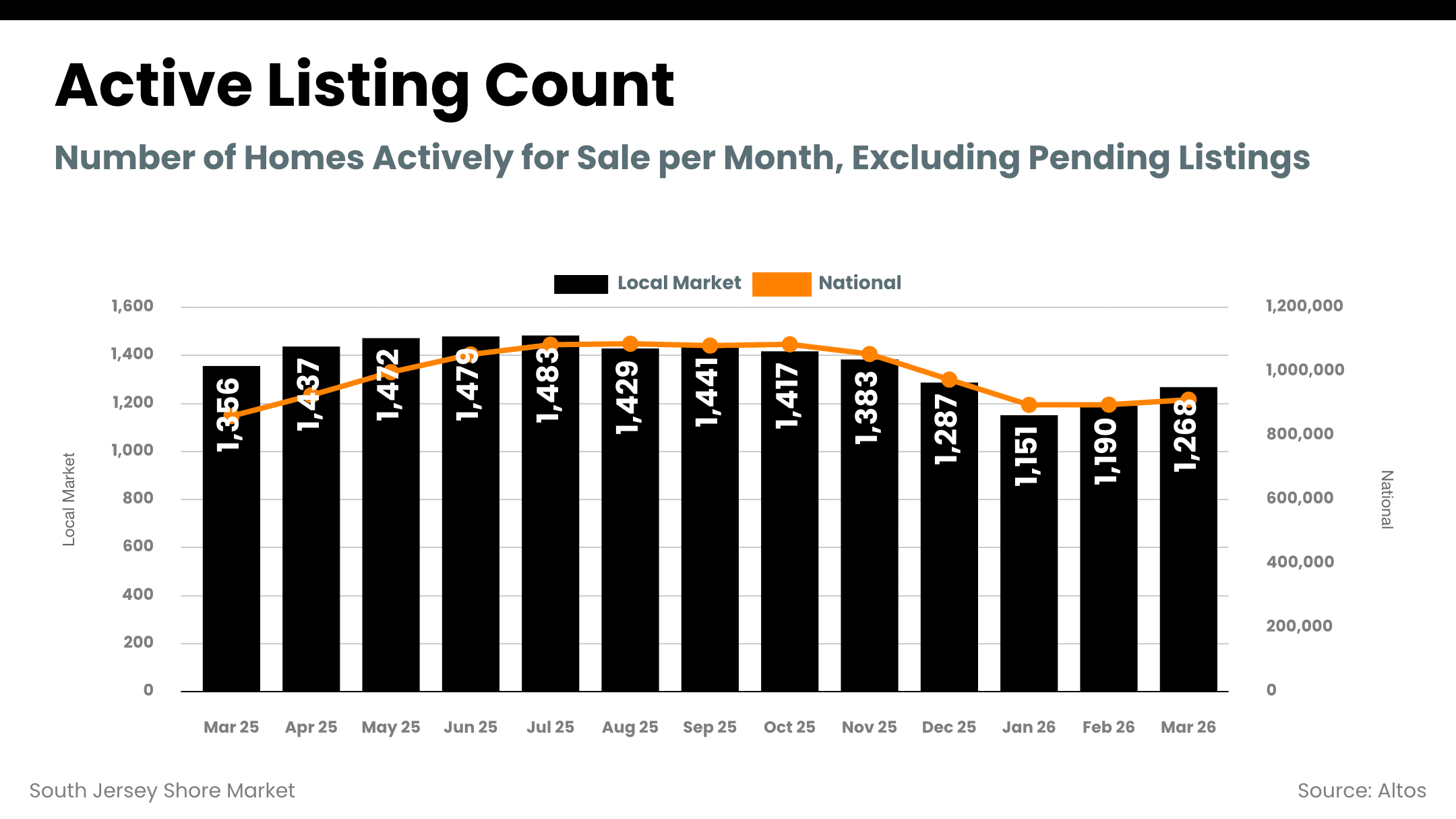 The combined South Jersey Shore market entered April with rising active inventory, increasing pending sales, lower days on market, and balanced overall supply levels. Inventory increased from late winter into early spring, but buyer activity also increased. This prevented inventory from building too quickly and helped maintain pricing stability.