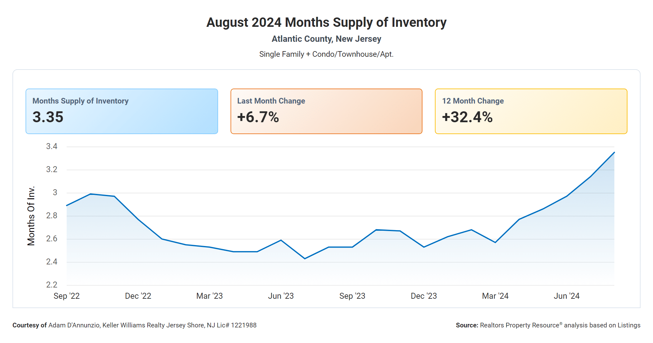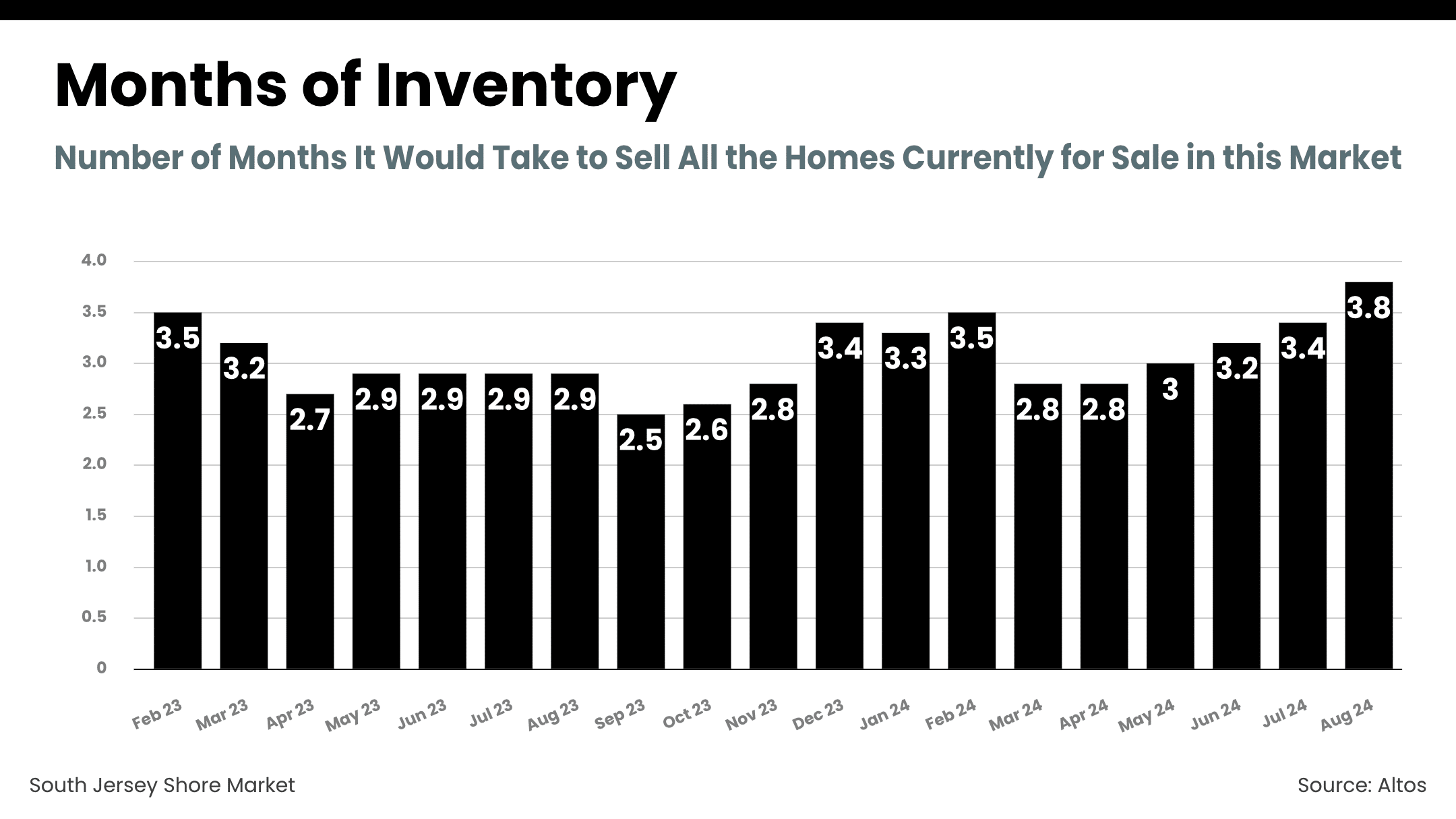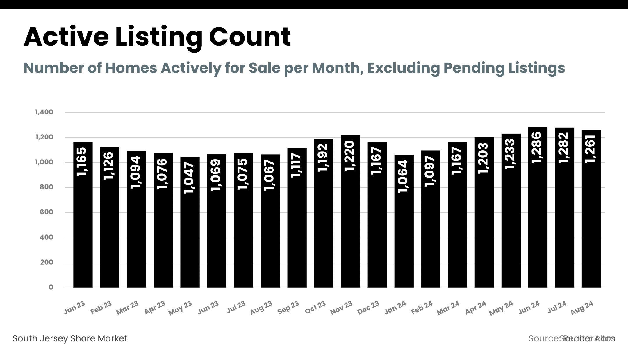 The South Jersey Shore market has seen some notable changes over the past year. Active listings have increased compared to August 2023, rising from 1,067 to 1,261. However, pending listings have slightly dipped, signaling a shift in buyer activity. Inventory has also increased, with months of supply jumping from 2.9 months in 2023 to 3.8 months in August 2024. This trend suggests a growing number of homes available on the market, providing more options for buyers while giving sellers more competition.