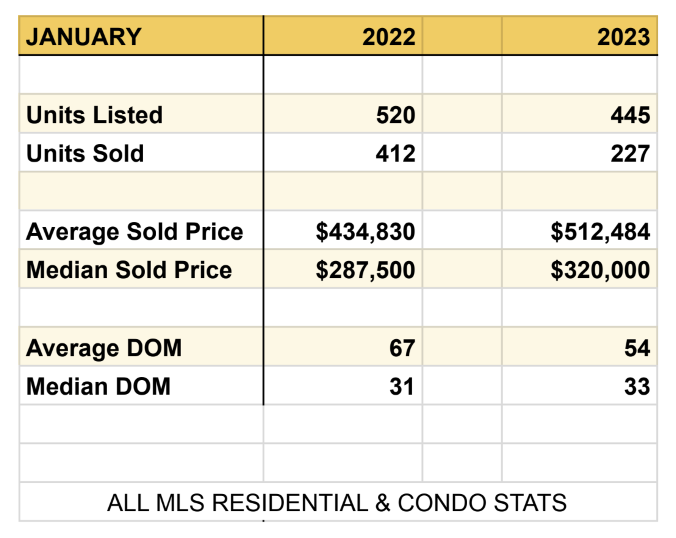 Just this past week, we’ve worked with multiple buyers and sellers in multiple offer situations. It’s just crazy to think that we’re still seeing this over three years now, but it’s really honestly the case. I don’t see it going anywhere anytime soon. Looking back on January, here’s a quick look at some of the MLS stats.